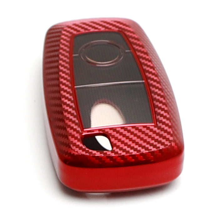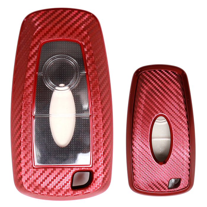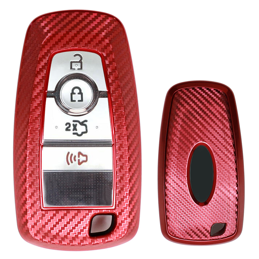 This page features a brand new set of iJDMTOY Red Chrome Plated w/ Carbon Fiber Pattern Bottom Full Coverage TPU Key Fob Protective Case Compatible With Ford 2018-up Ford Mustang F150 F250 Explorer Expedition Smart Key.