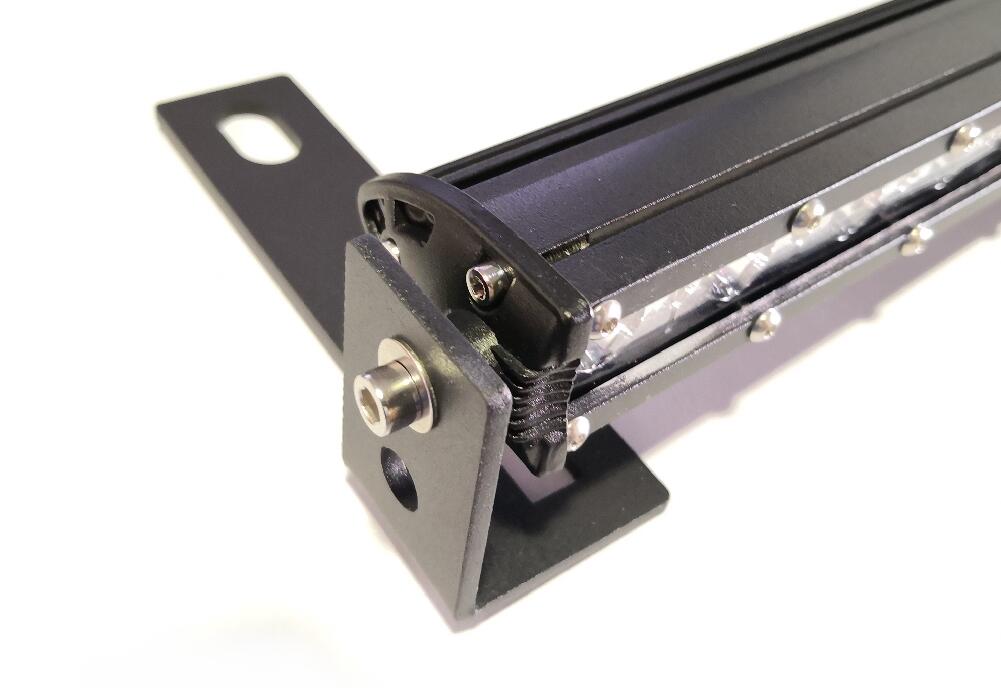 Step 1: Attach the brackets on the LED light bar in a perpendicular fashion. You have two options on how you want to screw in the components together. The first hole has the LED light bar poke out a bit more and the second hole allows the LED light bar to sit back a bit.