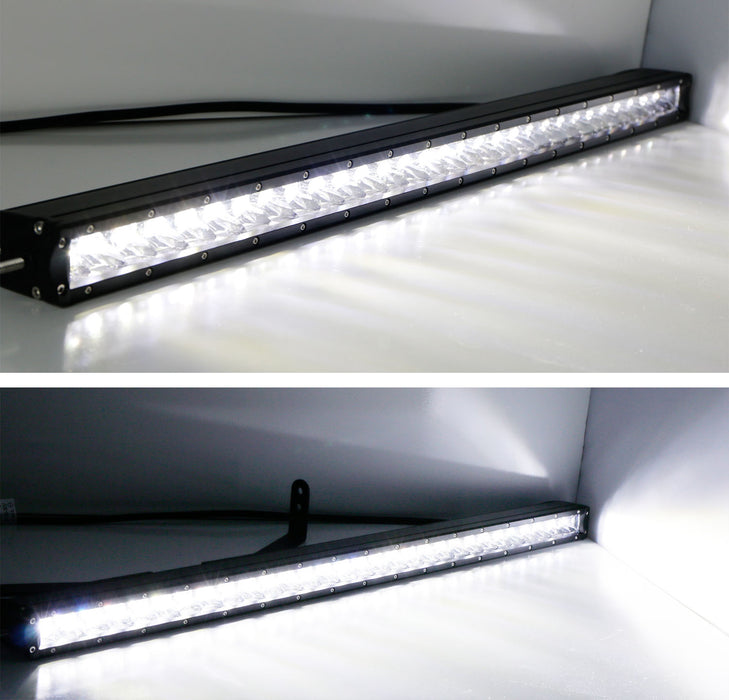 • Complete kit comes with one piece extremely bright 30" 150W high power CREE LED light bar with a set of black powder coated steel grille area mounting brackets and wiring harness w/ on/off switch
