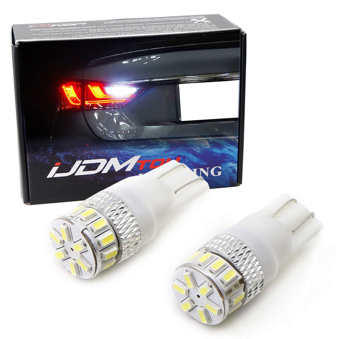 This page features a brand new set of iJDMTOY (2) 360-Degree Illuminating 18-SMD 168 194 912 920 921 T10 LED Bulbs Compatible With Parking Lights or Backup Lights.